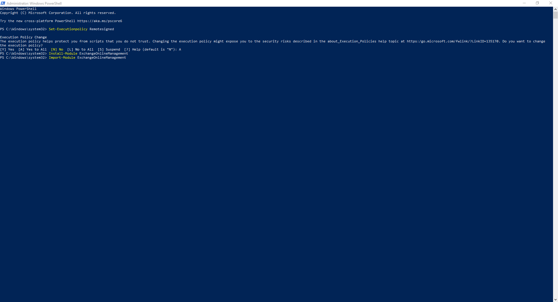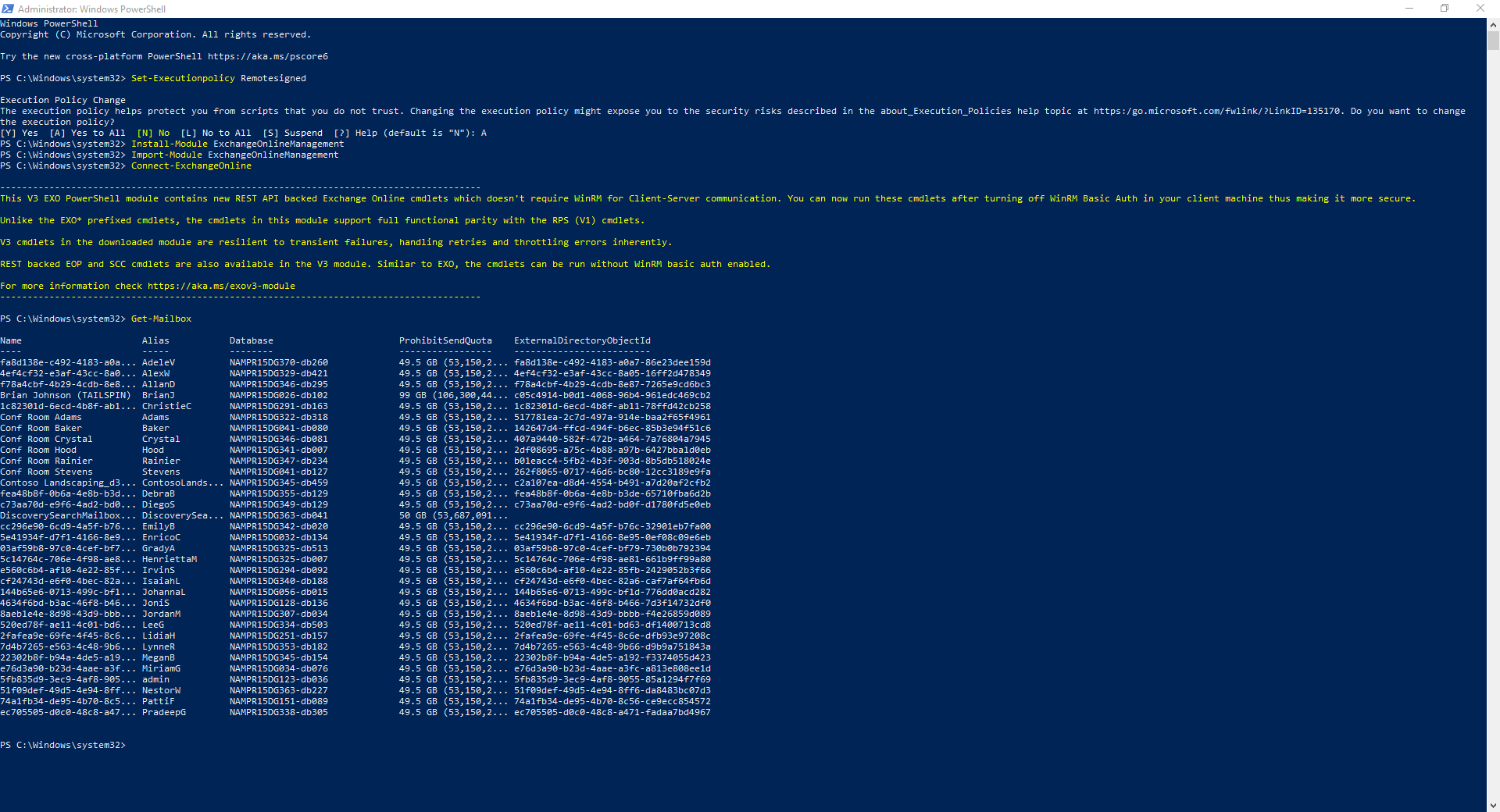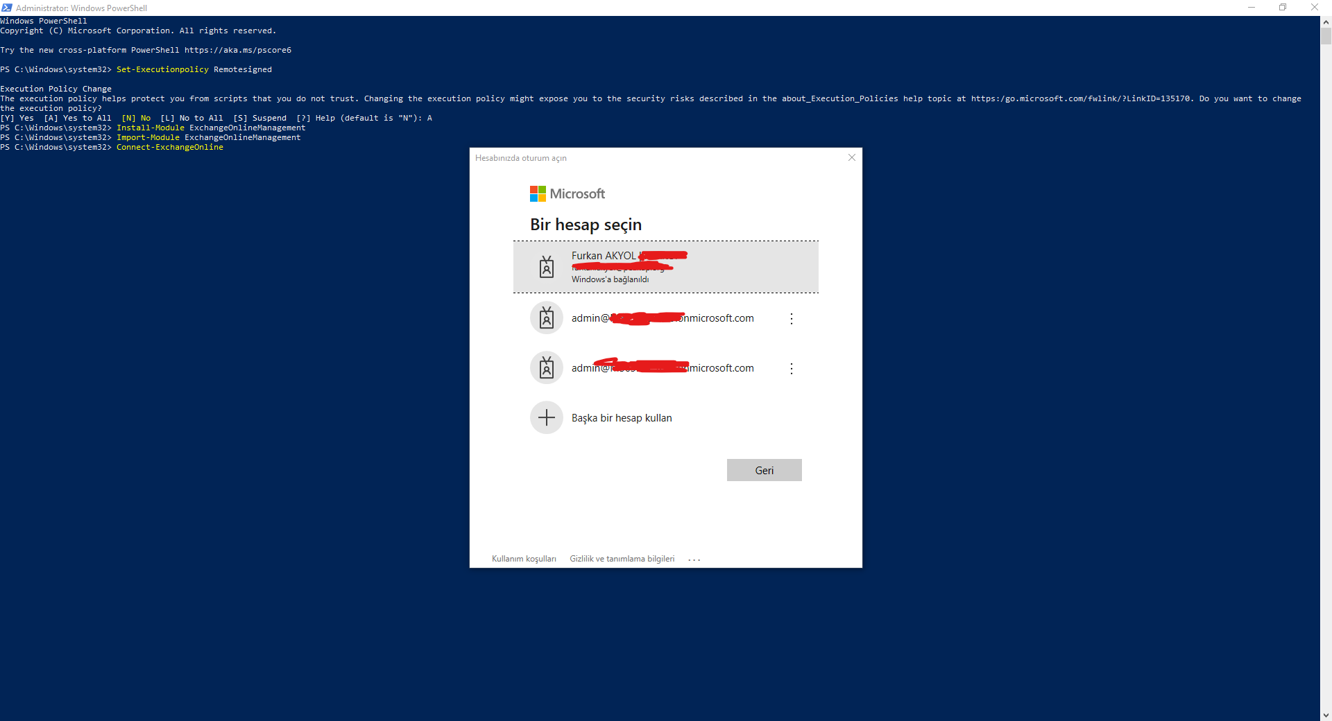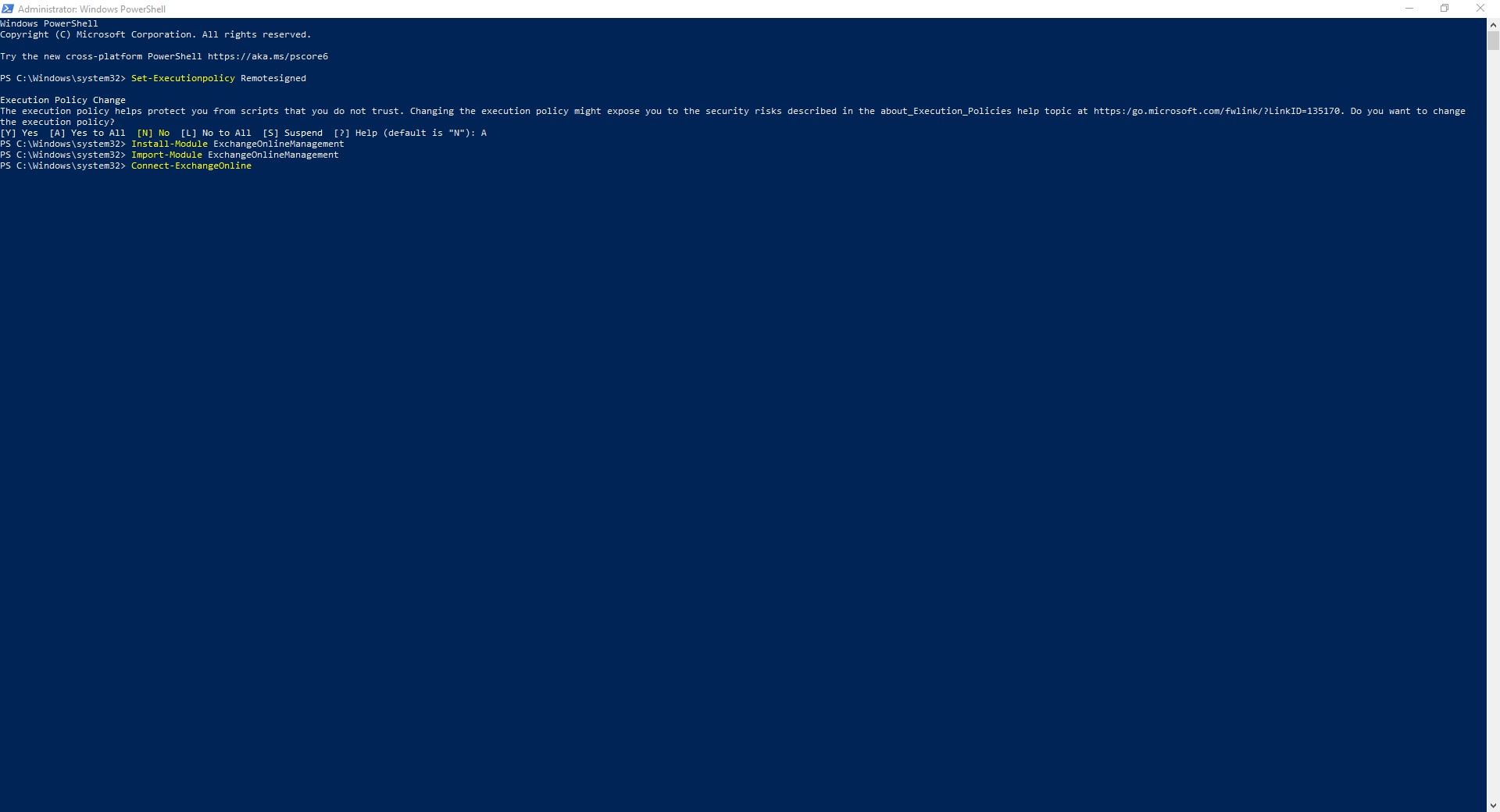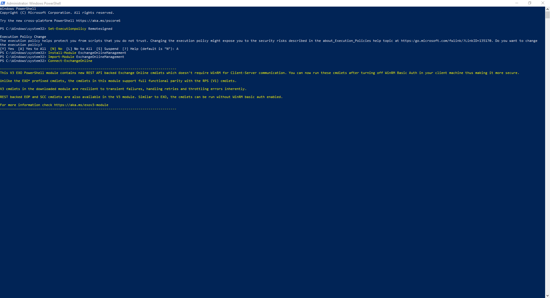 • İşlemi tamamladıktan sonra, PowerShell üzerinden Exchange Online’a başarılı bir şekilde bağlandığınızda, yukarıda belirtilen işlemleri gerçekleştirmek için komutları kullanabilirsiniz.